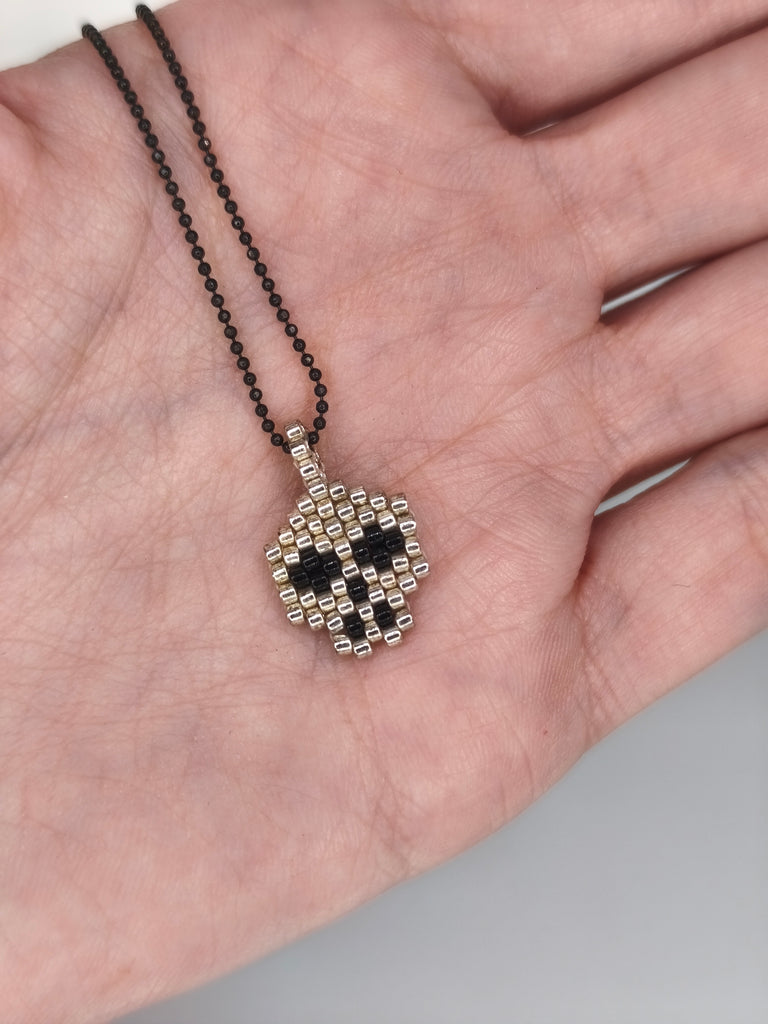 Collar con colgante de calavera, cosido a mano cristal a cristal con cristal japonés negro brillante y plateado (bañado en plata de primera ley 925). Cuelga de una original cadena de bolitas diamantadas de plata de primera ley 925 con baño de rutenio de 42 cm de largo. Una joya única que combina estilo rebelde y sofisticación artesanal.
