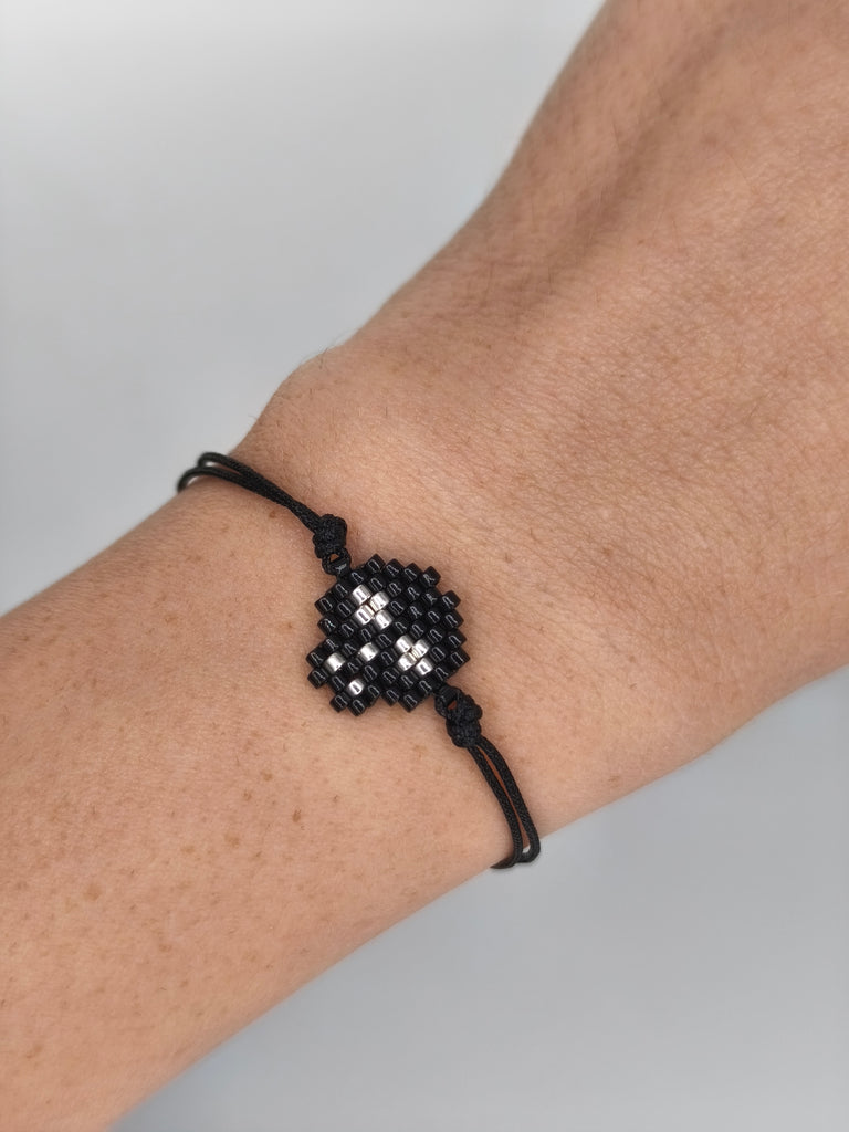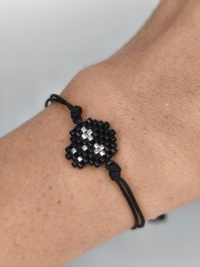 Pulsera con colgante de calavera, cosida a mano cristal a cristal con cristal japonés negro brillante y plateado (bañado en plata de primera ley 925). Todo montado en hilo encerrado negro de medida ajustable con nudo corredizo y en el terminal, dos preciosos cristales checos negros. Una joya única que combina estilo rebelde y sofisticación artesanal.