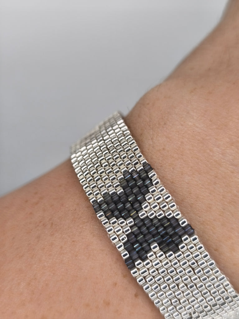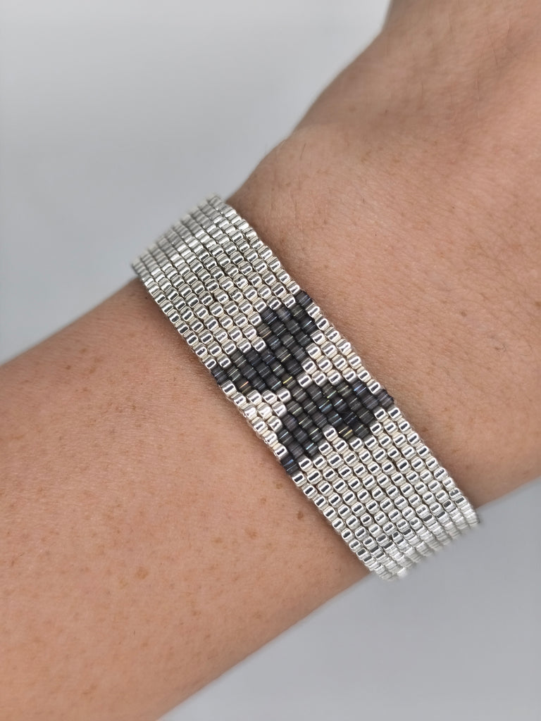 Pulsera artesanal elaborada con cristal japonés plateado bañado en plata de primera ley 925, diseñada en 10 carriles que aportan un acabado elegante y muy llamativo. En el centro destaca una mariposa en cristal japonés de color antracita ultra brillante, que se convierte en el detalle protagonista de la pieza.